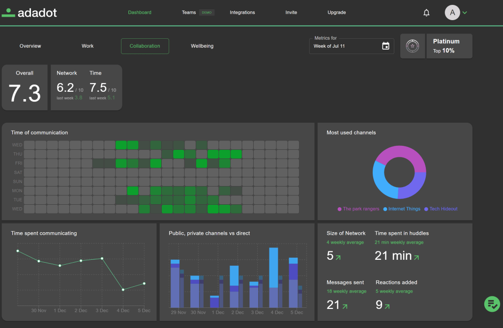 Productivity is important, but having appropriate counter metrics that ensure productivity practices are sustainable, seeking efficiencies rather than pillaging wellbeing, is a key tenet of what Adadot does. One wellbeing metric Adadot tracks is ‘out of hours comms’, which looks to address the typically unhealthy habit of checking emails and Slack late at night in a bid to bolster productivity. What we have found is quite the opposite, with medium to long-term productivity actually increasing when people afford themselves the time to switch off and decrease out of hours comms.